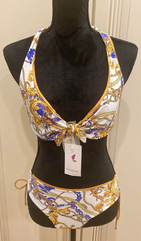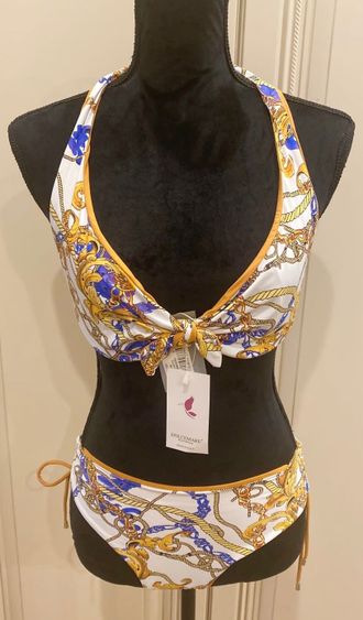 Шикарный двусторонний купальник с широкими мягкими чашками на косточках, с широкими галстучными завязками на шею, лиф также дополнен небольшим съемным декоративным элементом.
