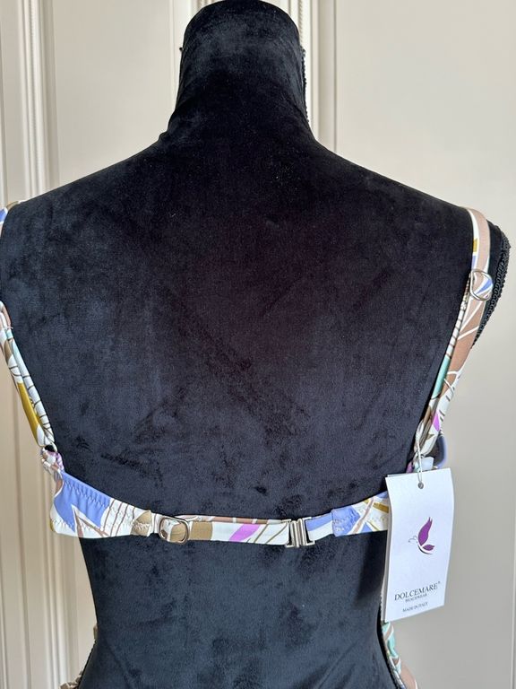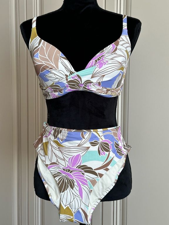 Эффектный раздельный купальник, лиф необычного кроя с драпировкой крест-накрест.