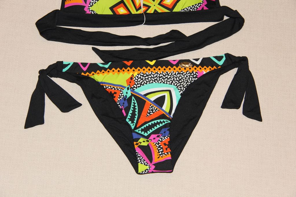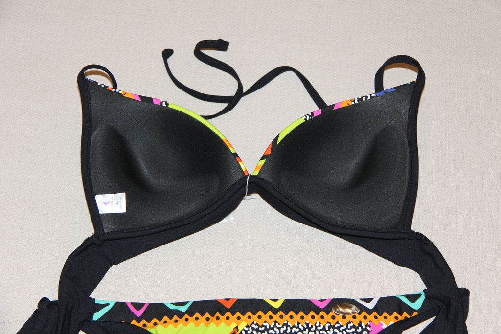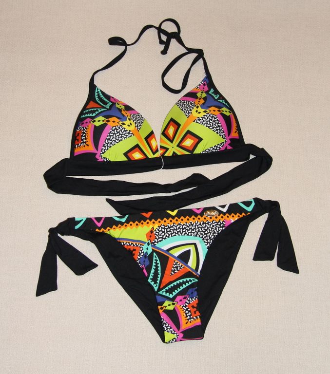 Каркасная чашка с пуш-ап, великолепно держит грудь, завязки на шее и на спине позволяют регулировать высоту груди и объем под грудью, удачно для женщин с промежуточными размерами. Плавки с заниженной линией талии, с завязками.