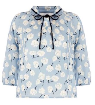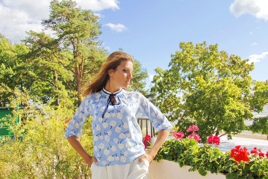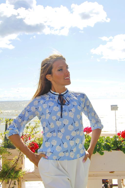- особенности модели: блуза с небольшим декольте, фиксируется на вороте лентой, рукава 1/8, декорированы тонкой резинкой