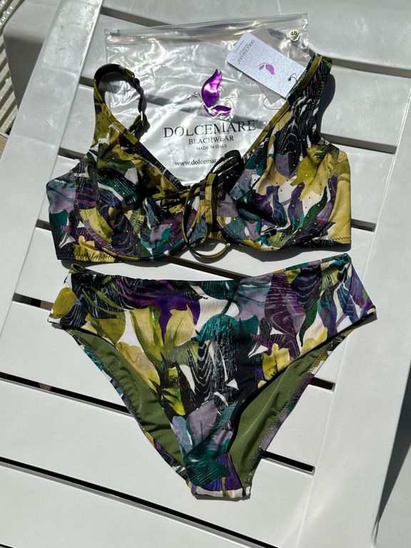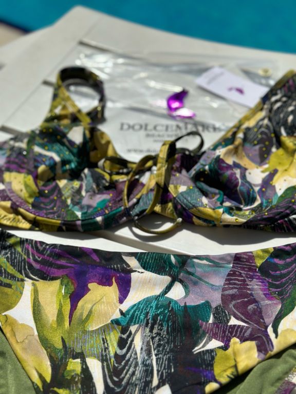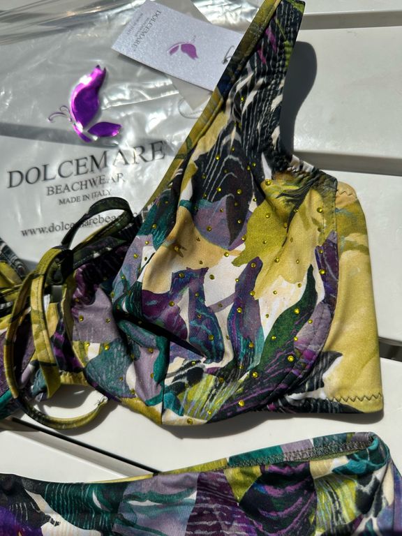 Плавки глубокой посадки с широкими бочками. Принт в фисташковых и баклажановых оттенках, лиф богато украшен кристаллами Swarowski, которые переливаются на солнце.