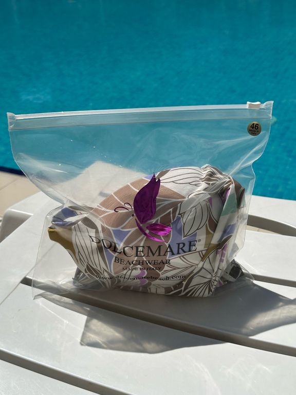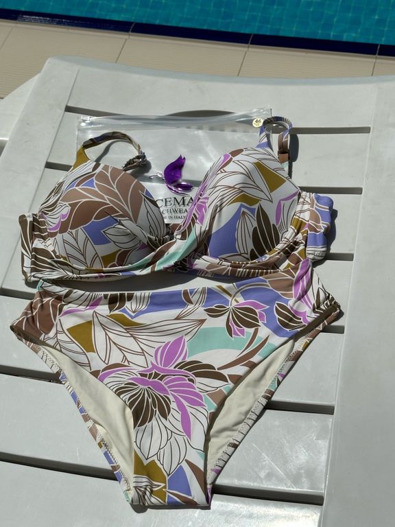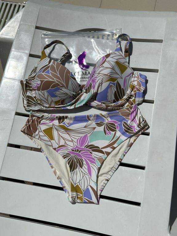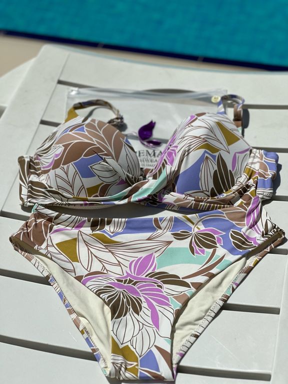 Эффектный раздельный купальник, лиф необычного кроя с драпировкой крест-накрест.
