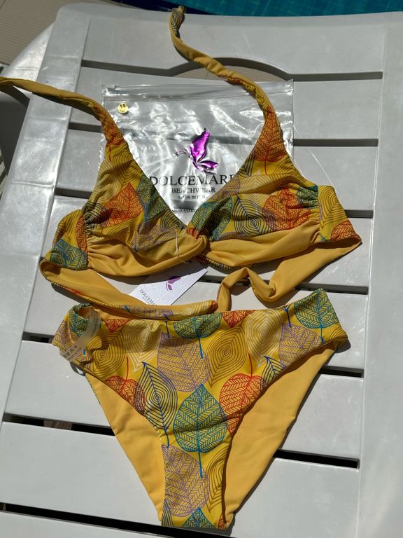 Лаконичный двусторонний раздельный купальник. Бюст – мягкие вместительные чашечки на перекрестной ленте-поддержке, элегантные галстучные завязки на шею (халтер), которые можно завязывать крест-накрест на спинке или оставить бретелями на плечах. Плавки двусторонние комфортной посадки с широкими бочками. Модель выполнена в технике детального расположения принта.