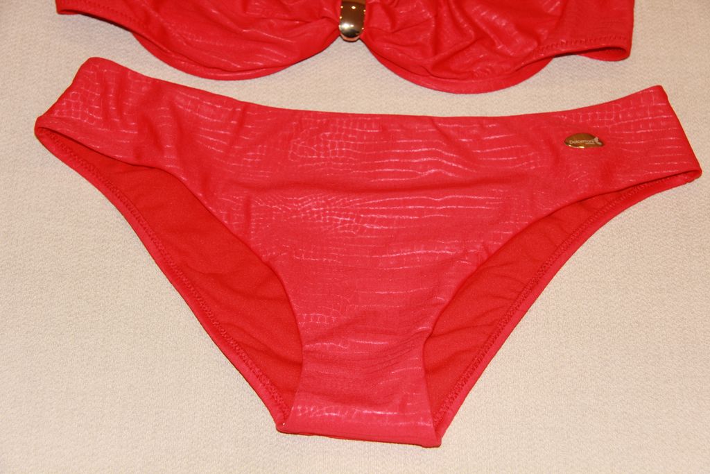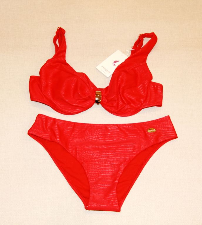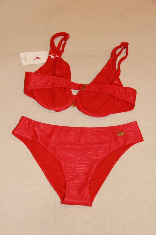 Яркий купальник с лифом на косточках, цельнокроеными бретелями. Бюст мягкий, с эластичной чашкой на кости. Бретели регулируются по длине, застегивается на спине. Декоративный элемент, создающий акцент в зоне декольте.